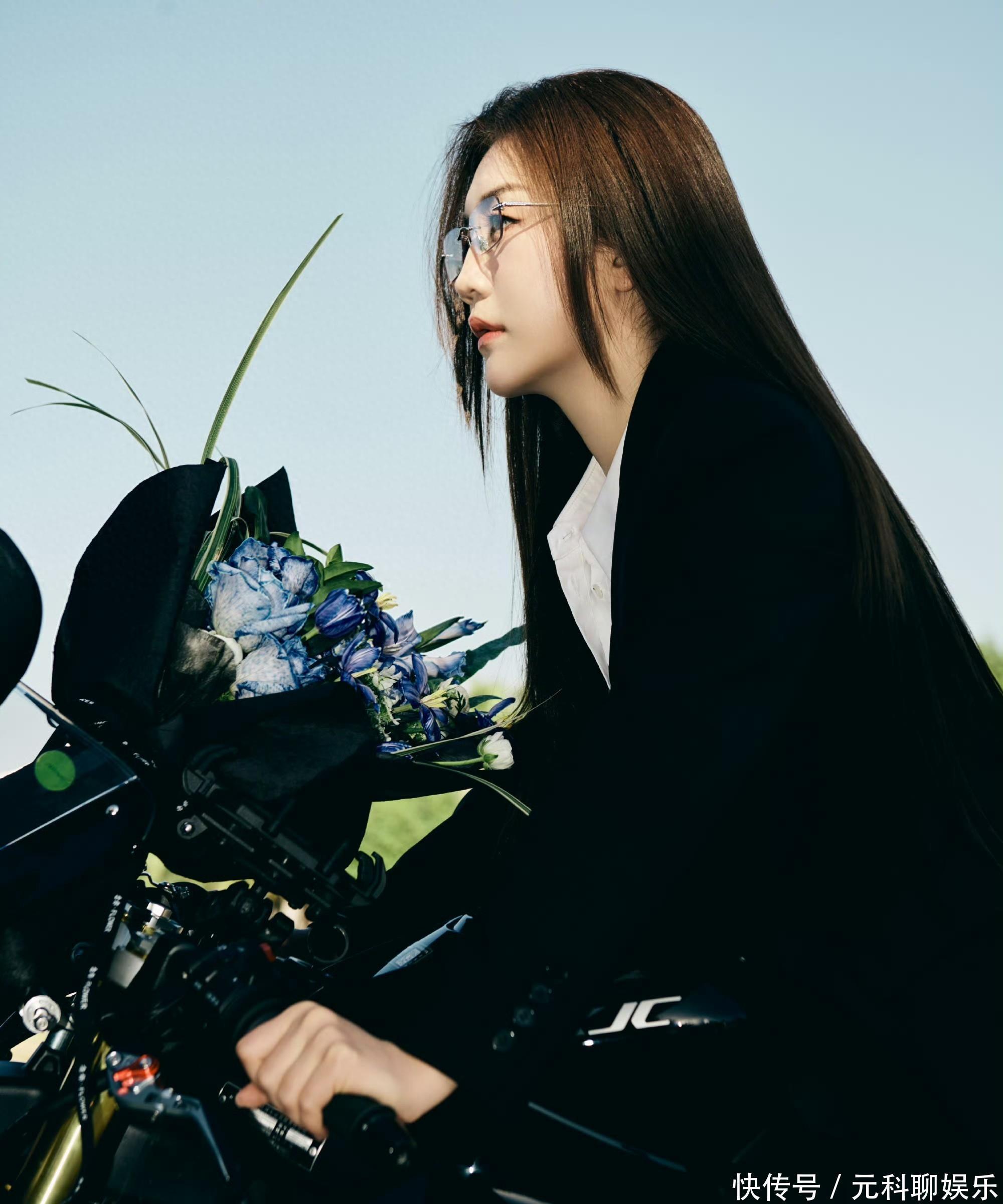 陈梦在社交平台上晒出一组机车美照,西装眼镜配重型机车